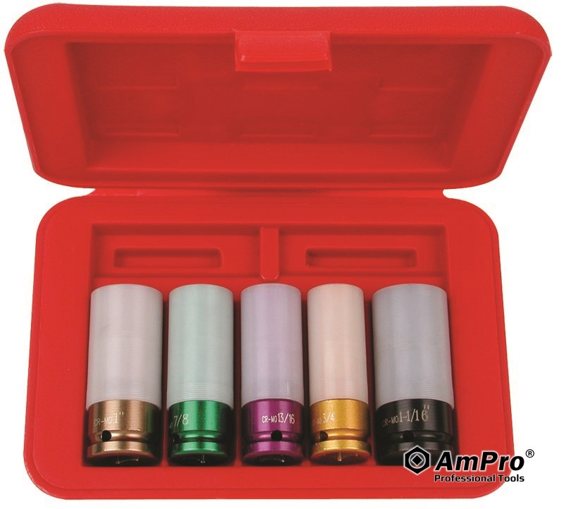Features ·CHROME MOLYBDENUM STEEL FOR STRENGTH AND DURABILITY ·PROTECTIVE SLEEVES AND PLASTIC INSERT DESIGN PREVENTS WHEELS AND LUG NUTS FROM SCRATCHING ·THIN WALL AND DEEP HOLLOW DESIGN FITS MOST HIGH PERFORMANCE ALLOY WHEELS ·SIZES: 3/4", 13/16", 7/8", 1", AND 1-1/16"