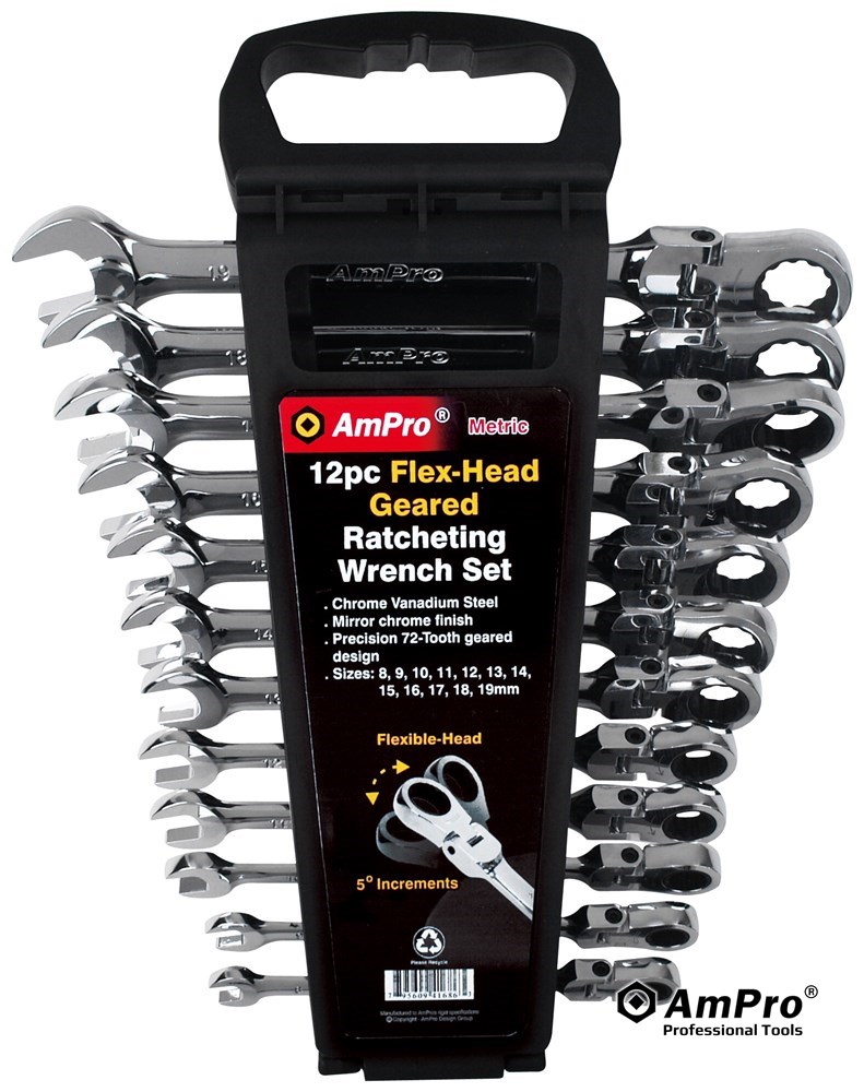 12PC FLEX-HEAD GEARED RATCHETING WRENCH SET (8 -19MM)