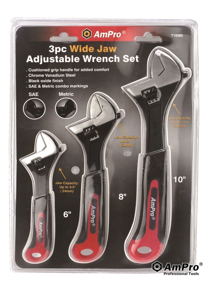 Description 3PC WIDE-JAW ADJUSTABLE WRENCH SET