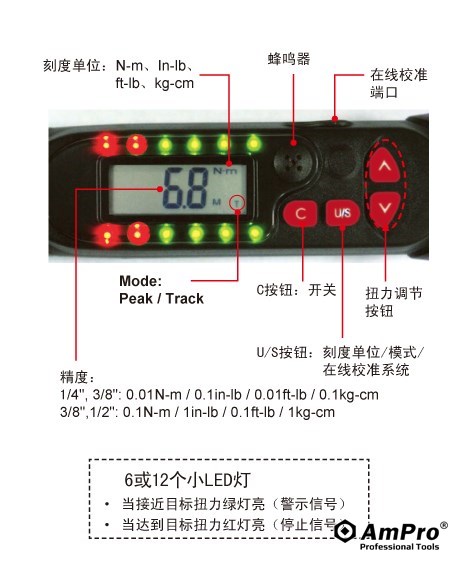 Features ·STANDARD FUNCTIONS INCLUDE TORQUE SETTING, UNIT SETTING, MODE SETTING, AND ONLINE CALIBRATION ·FUNCTIONS IN BOTH CLOCKWISE AND COUNTER-CLOCKWISE DIRECTIONS ·LCD PANEL SHOWS N-M, FT-LB, IN-LB AND KG-CM MEASUREMENTS ·AUDIBLE AND VISIBLE TORQUE CONFIRMATION BY MEANS OF BUER AND LED INDICATOR ·EASY SETUP PER APPLICATION·RANGE: 30 - 340 N-M ·HEAD: 1/4", 3/8", 1/2" ·ACCURACY: ±1% OR ±2% (CW)