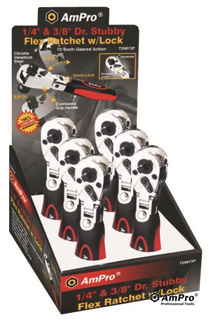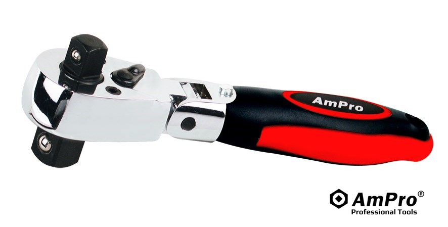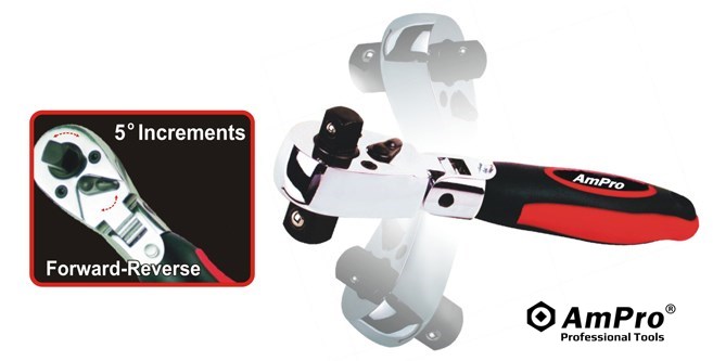 Features . FLEX HEAD SWINGS 180°FOR ADDED VERSATILITY . RAPID-ACTION, DUAL-HEAD DRIVE . CHROME VANADIUM STEEL . DYNAMIC, CUSHIONED HANDLE ENSURES SECURE GRIP . STUBBY SIZE ALLOWS ACCESS IN CONFINED AREAS