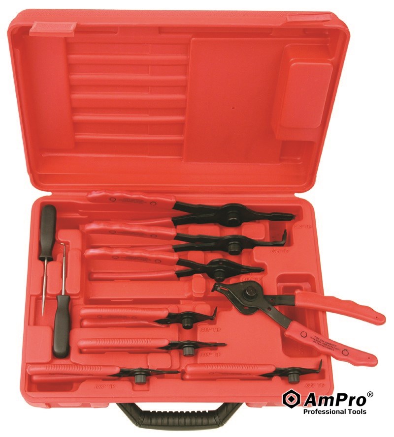 Features ·11PC COMBINATION OF INTERNAL, EXTERNAL, STRAIGHT, AND BEND SNAP RING PLIERS ·CHROME MOLYBDENUM STEEL, HEAT-TREATED FOR STRENGTH AND DURABILITY ·INSULATED VINYL HANDLE FOR POSITIVE GRIP ·5" HOOK AND PICK TOOLS INCLUDED
