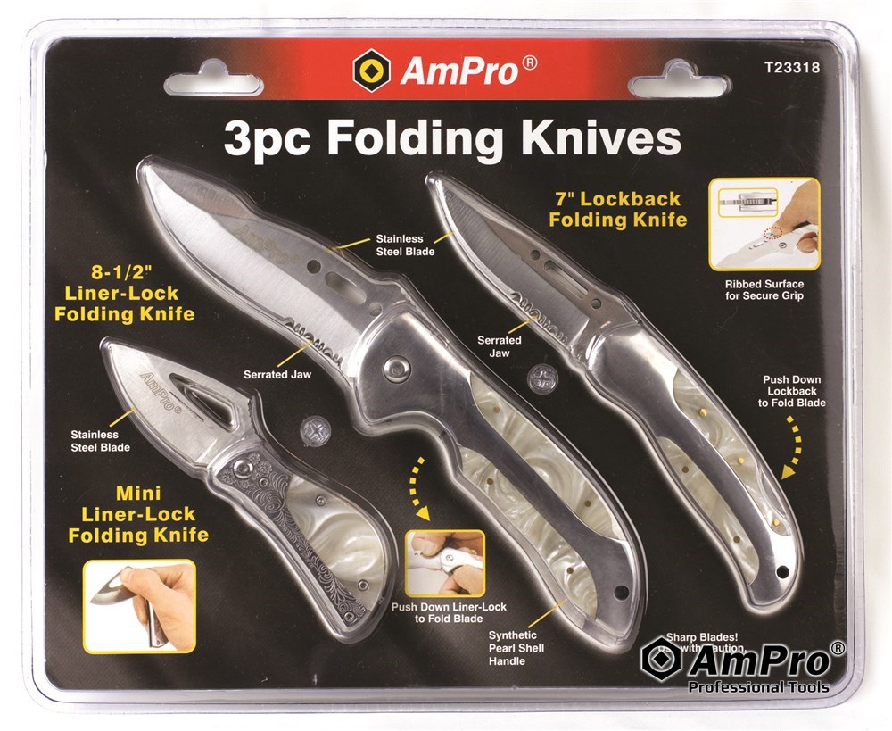 Features 8-1/2" LINER-LOCK FOLDING KNIFE ·HEAVY DUTY CUTTING BLADE ·HIGH QUALITY STAINLESS STEEL ·FOLDS IN HALF FOR COMPACT STORAGE ·SAFETY LOCK 7" LOCKBACK FOLDING KNIFE ·HEAVY DUTY CUTTING BLADE ·STAINLESS STEEL BLADE ·FOLDS IN HALF FOR COMPACT STORAGE ·SAFETY LOCK 4-3/4" MINI FOLDING KNIFE ·4-3/4" LINER-LOCK KNIFE WITH 2" STAINLESS STEEL BLADE ·SYNTHETIC PEARL SHELL HANDLE ·POCKET-SIZED FOR EASY CARRYING