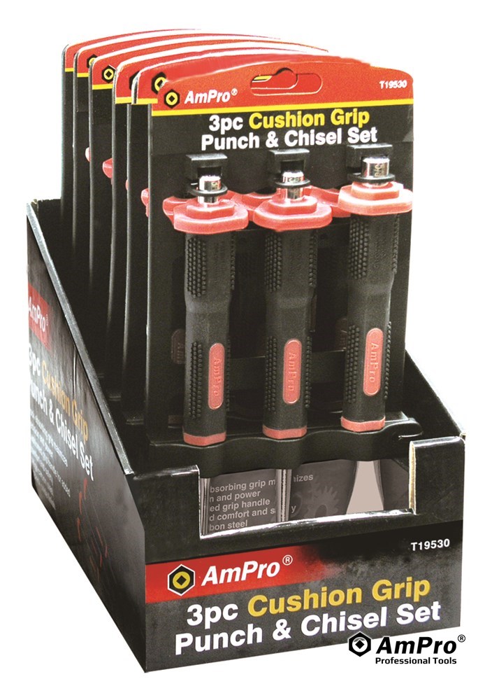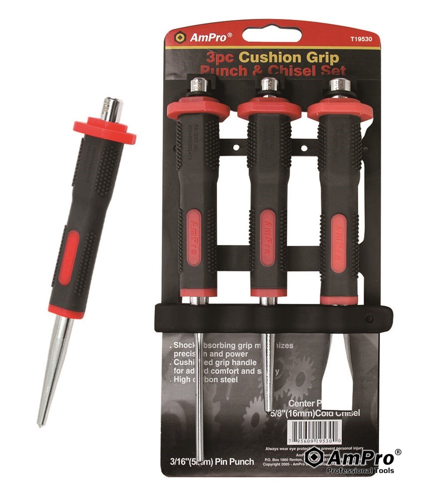 Description 3PC CUSHIONED GRIP PUNCH AND CHISEL SET