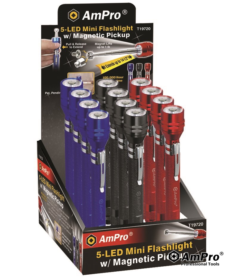 Features 4 LR44 LITHIUM BUTTON CELL BATTERIES INCLUDED 14-1/2" EXTENDABLE RETRIEVER MAGNET LIFTS UP TO 1 LB 5-LED LIGHTS LIFETIME: 100,000 HRS RUNTIME: 20 HRS