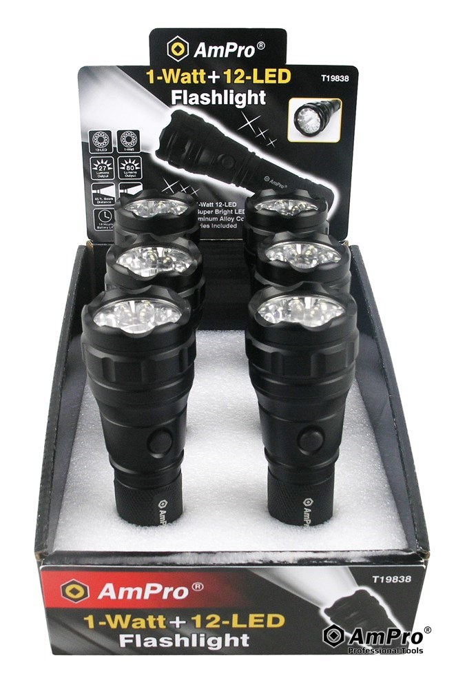 Features 2-LIGHT MODE: 1-WATT 12-LED HIGH INTENSITY SUPER BRIGHT LED FLASHLIGHT HEAVY DUTY ALUMINUM ALLOY CONSTRUCTION INCLUDES 3 AAA BATTERIES