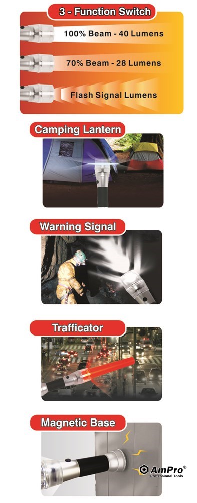 Features MAGNETIC BASE 4-IN-1 EMERGENCY LIGHT, TRAFFICA TOR, FLASHLIGHT AND LANTERN 3 FUNCTION SWITCH: 100% BEAM, 70% BEAM AND FLASH SIGNAL