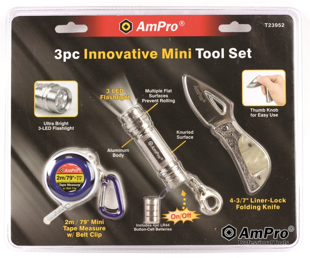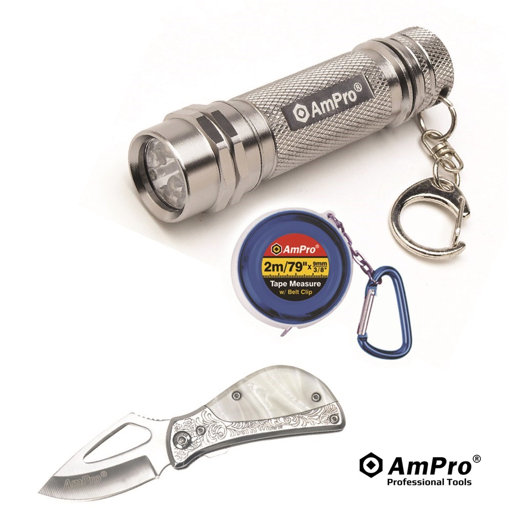 Features COMPACT DESIGN WITH KEYCHAIN • MADE OF MACHINED ALUMINUM 100,000 HOUR LED LIFETIME • OVER 5 HOURS OF CONTINUOUS USE INCLUDES 4PC LR44 BUTTON-CELL BATTERIES 2M / 79" MINI TAPE MEASURE WITH BELT CLIP 4-3/4" LINER-LOCK FOLDING KNIFE 2" BLADE LENGTH ONE-HAND OPENING SYNTHETIC PEARL SHELL HANDLE