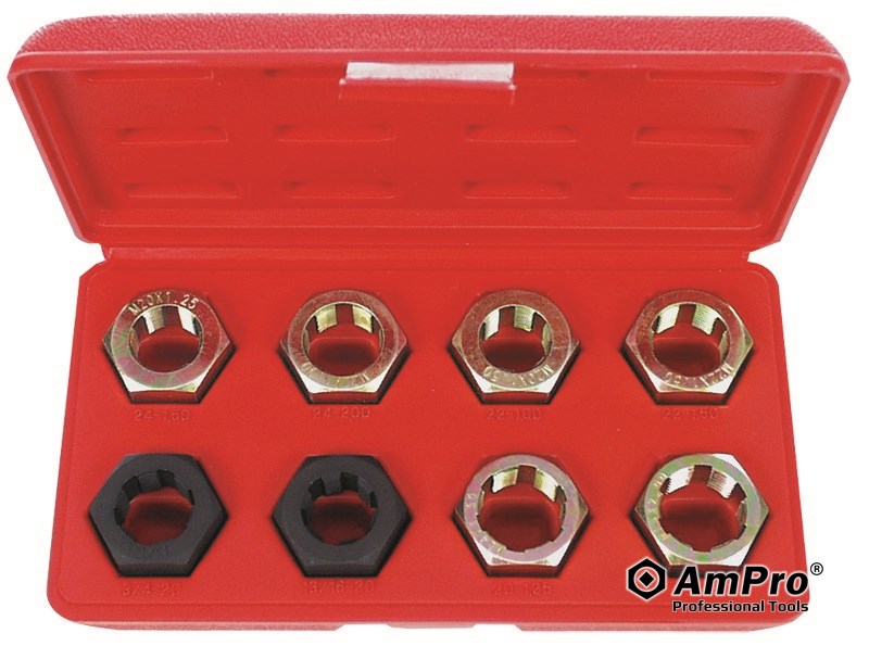 THIS TOOL SET ACCESSES AXLE THREADS ON SPINDLES OF EIGHT POPULAR DIE SIZES