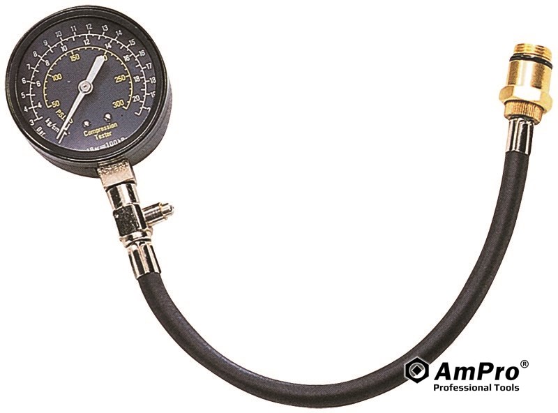Features ·ACCURATELY CHECKS COMPRESSION ON GASOLINE ENGINES ·COLOR-CODED, QUADRUPLE CALIBRATIONS WITH 0-300PSI, 21KG/CM2, 21BAR, AND 2100KPA ·HEAVY DUTY, FLEXIBLE HOSE WITH A 14/18MM ADAPTOR