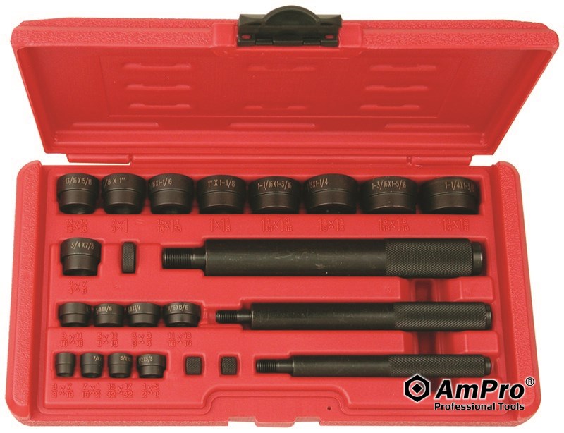 Features ·INCLUDES MOST POPULAR SIZES FOR BUSHING INSTALLATION WORKS ·DOUBLE-END DISC SIZE RANGES FROM 3/8" X 7/16" THROUGH 1-1/4" X 1-3/8" IN DIAMETER, IN 1/16" INCREMENTS ·THREE DRIVERS WITH EXTRA NUTS ·FITS AUTO, TRUCK, TRACTOR, AND FARMING EQUIPMENT