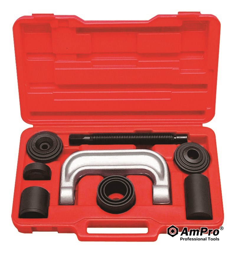 THIS TOOL SET HAS FOUR FUNCTIONS: REMOVAL / INSTALLATION OF BALL JOINTS, UNIVERSAL JOINTS, TRUCK BRAKE ANCHOR PINS AND 4WD BALL JOINTS. BOTH BALL