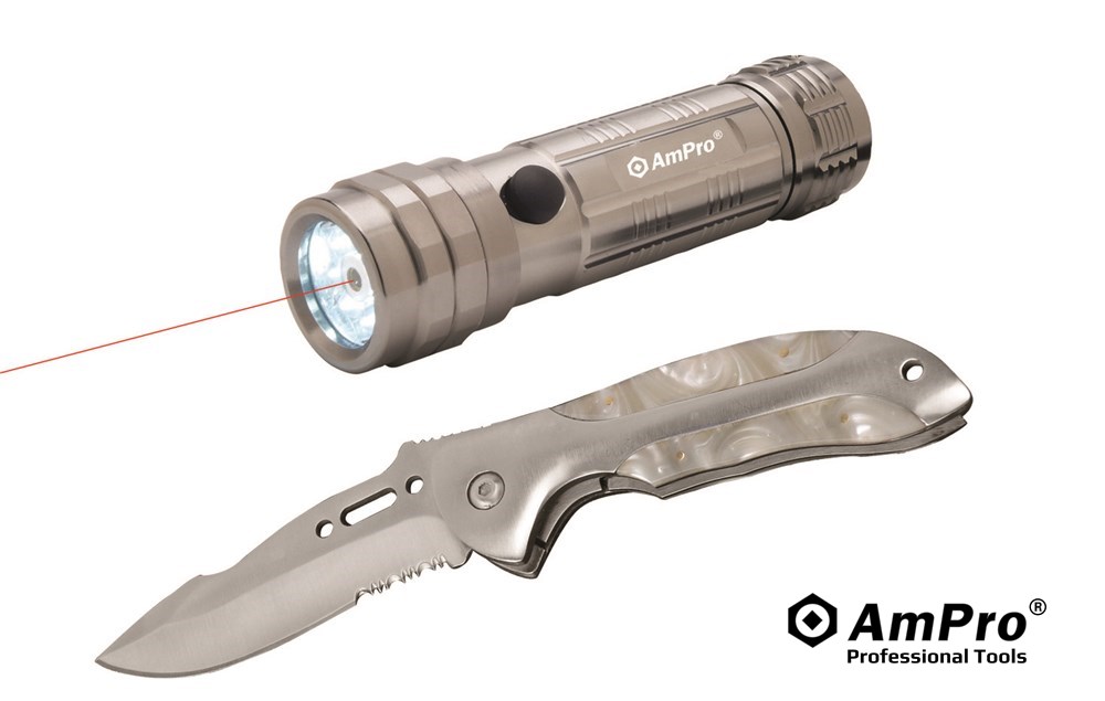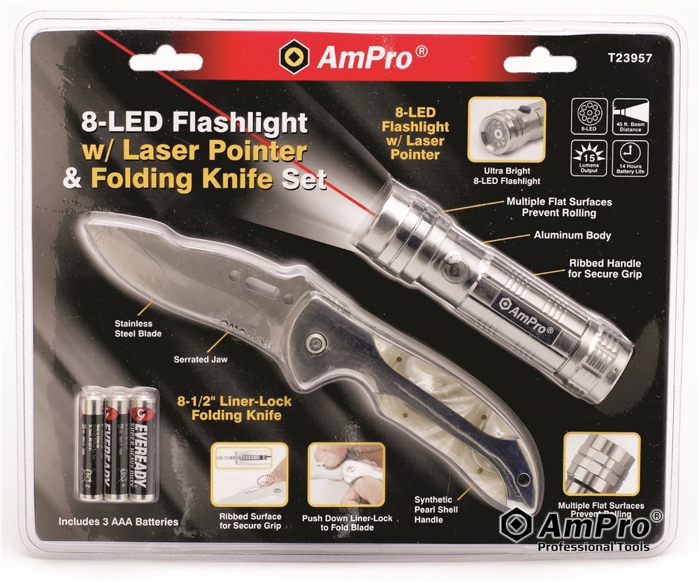 8-LED FLASHLIGHT W/ LASER POINTER & FOLDING KNIFE SET