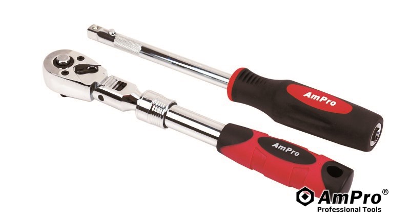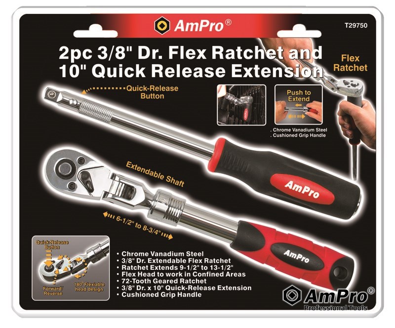 Features ·3/8" DR. EXTENDABLE FLEX RATCHET, 9-1/2" TO 13-1/2" ·FLEX HEAD TO WORK IN CONFINED AREAS ·72-TOOTH GEARED RATCHET ·3/8" DR. X 10" QUICKRELEASE EXTENSION ·CHROME VANADIUM STEEL ·CUSHIONED GRIP HANDLE