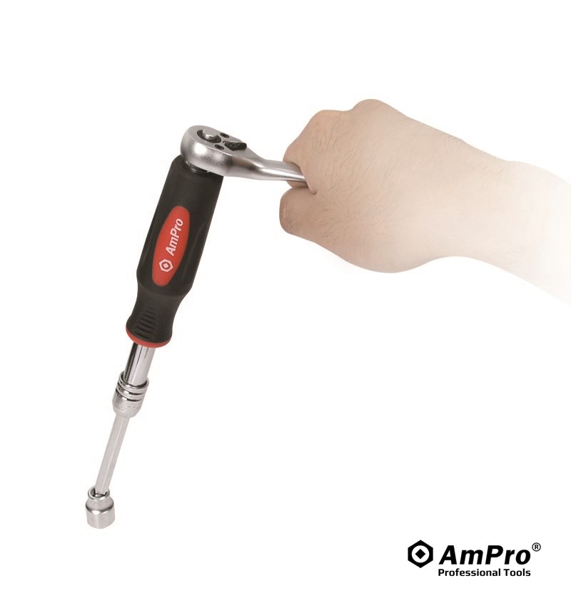 Features ·QUICK-RELEASE EXTENSION BAR ·CHROME VANADIUM STEEL ·RIBBED, CUSHION GRIP HANDLE ·EXCELLENT FOR HARD-TO-REACH AREAS ·EXTENDS 7-1/2" TO 12-1/2"
